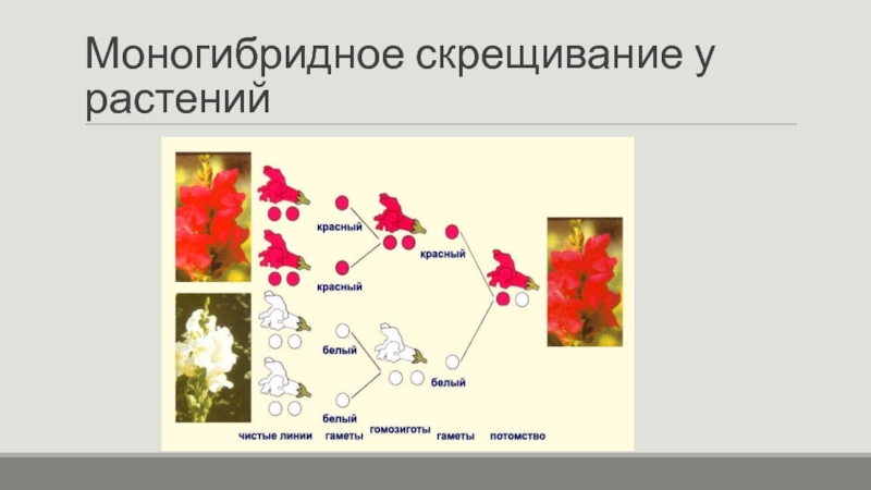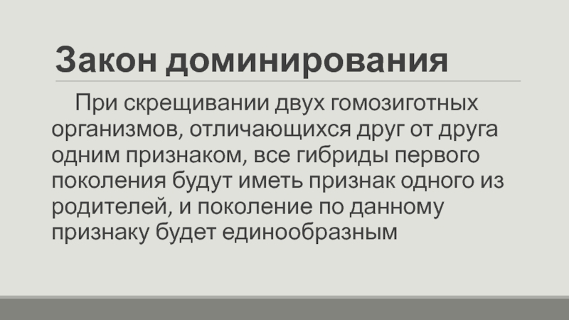 Закон доминирования  При скрещивании двух гомозиготных организмов, отличающихся друг от друга одним признаком, все гибриды первого