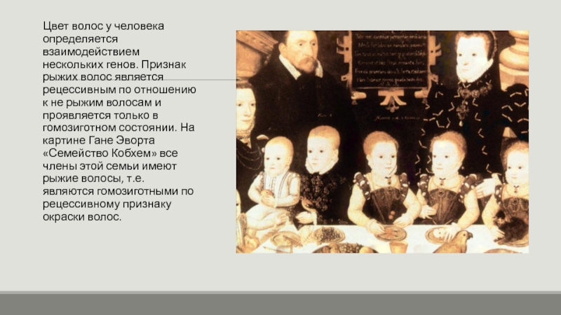 является рецессивным по отношению к не рыжим волосам и проявляется только в гомозиготном состоянии. На картине Гане Эворта «Семейство Кобхем» все члены этой семьи имеют рыжие волосы, т.е. являются гомозиготными по рецессивному признаку окраски волос.