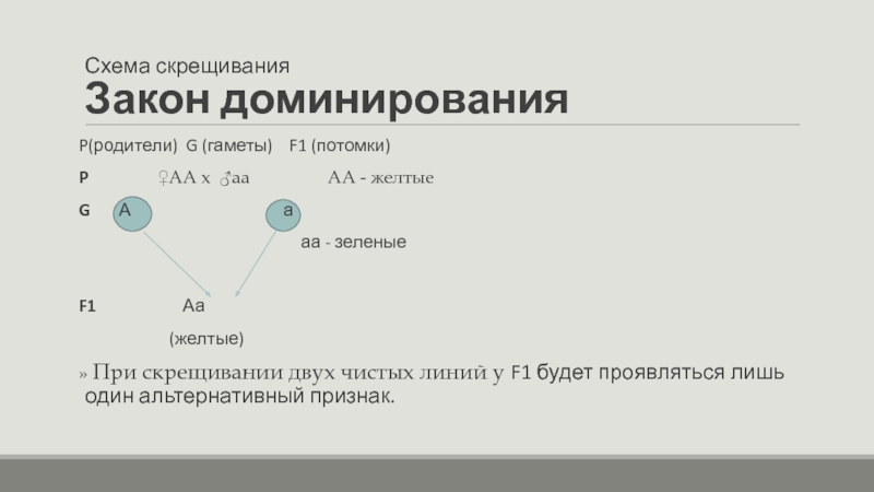 Схема скрещивания  Закон доминированияP(родители) G (гаметы)  F1 (потомки)P