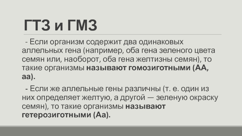 ГТЗ и ГМЗ  - Если организм содержит два одинаковых аллельных гена (например, оба гена зеленого цвета