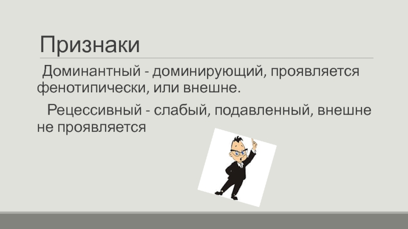 Признаки  Доминантный - доминирующий, проявляется фенотипически, или внешне.  Рецессивный - слабый, подавленный, внешне не проявляется