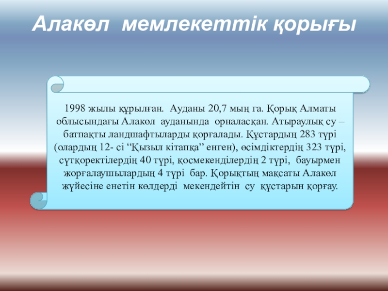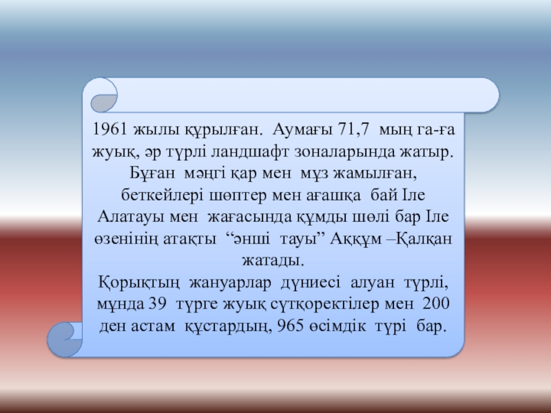 Слайд 171961 жылы құрылған. Аумағы 71,7 мың га-ға жуық, әр түрлі ландшафт
