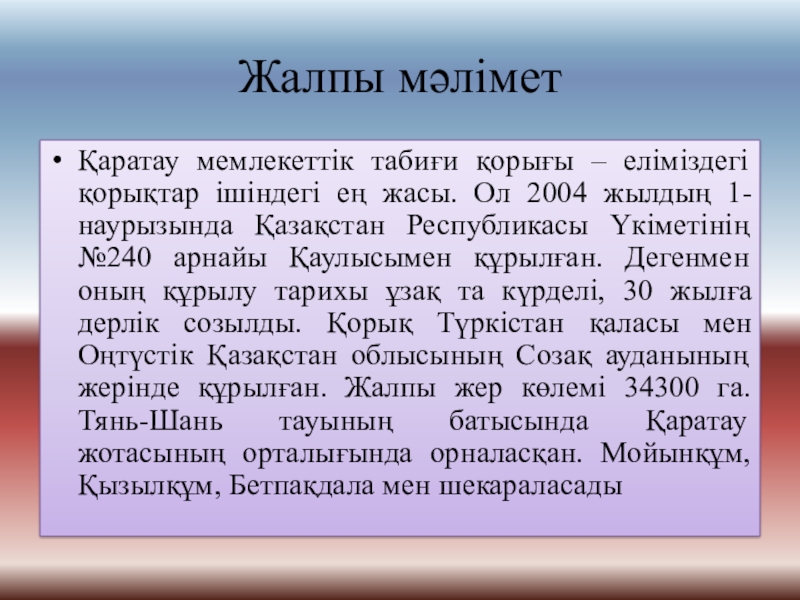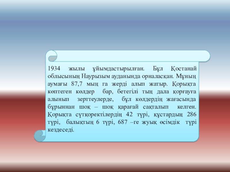 Слайд 131934 жылы ұйымдастырылған. Бұл Қостанай облысының Наурызым ауданында орналасқан. Мұның аумағы