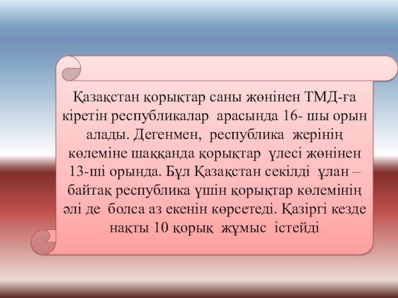 Слайд 7Қазақстан қорықтар саны жөнінен ТМД-ға кіретін республикалар арасында 16- шы орын