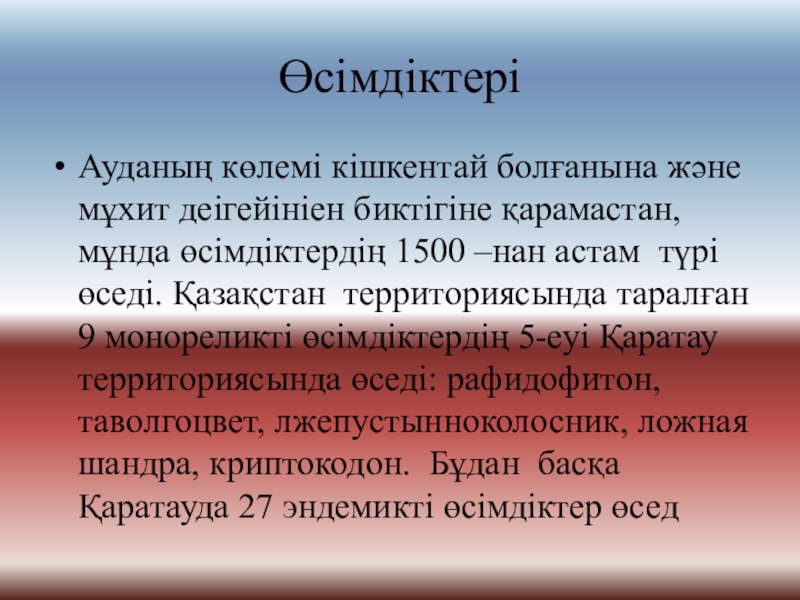 1500 –нан астам түрі өседі. Қазақстан территориясында таралған 9 монореликті өсімдіктердің 5-еуі Қаратау территориясында өседі: рафидофитон, таволгоцвет, лжепустынноколосник, ложная шандра, криптокодон. Бұдан басқа Қаратауда 27 эндемикті өсімдіктер өсед