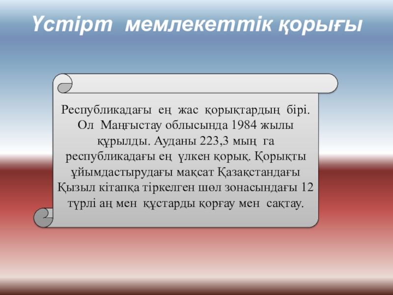 Республикадағы ең жас қорықтардың бірі. Ол Маңғыстау облысында 1984