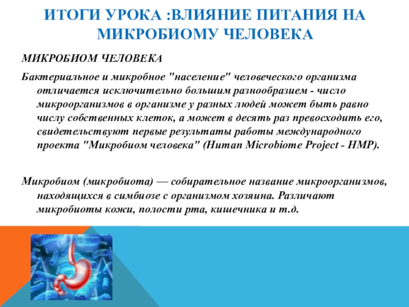 Слайд 34ИТОГИ УРОКА :Влияние питания на микробиому человека