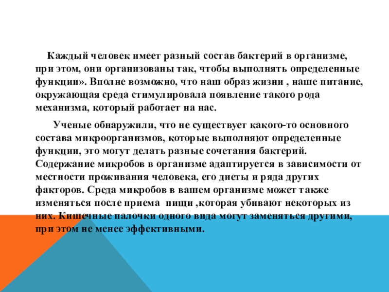 разный состав бактерий в организме, при этом, они организованы так, чтобы выполнять определенные функции». Вполне возможно, что наш образ жизни , наше питание, окружающая среда стимулировала появление такого рода механизма, который работает на нас.