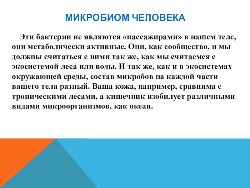 не являются «пассажирами» в нашем теле, они метаболически активные. Они, как сообщество, и мы должны считаться с ними так же, как мы считаемся с экосистемой леса или воды. И так же, как и в экосистемах окружающей среды, состав микробов на каждой части вашего тела разный. Ваша кожа, например, сравнима с тропическими лесами, а кишечник изобилует различными видами микроорганизмов, как океан.