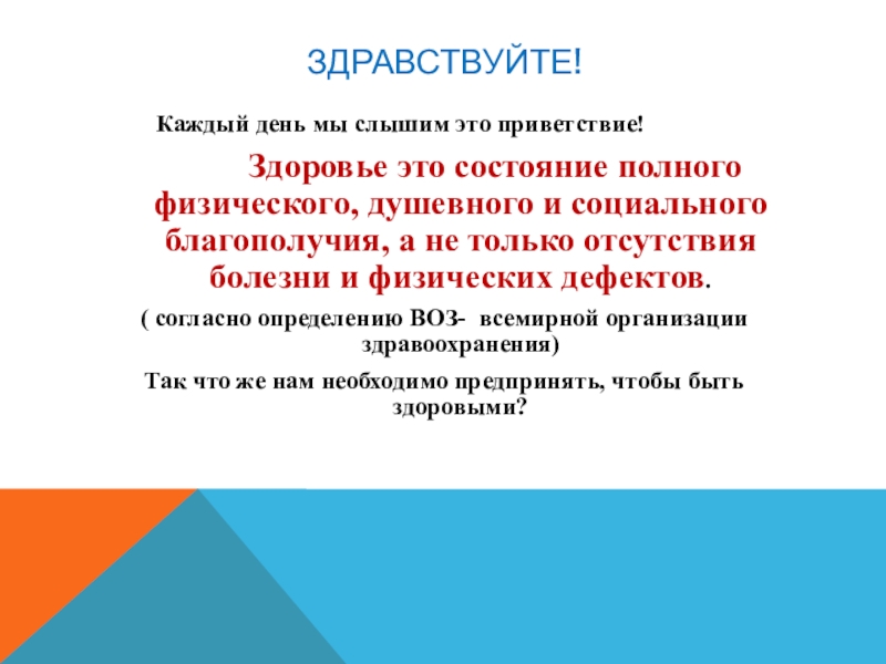 Здоровье это состояние полного физического, душевного и социального благополучия, а не только отсутствия болезни и физических дефектов.