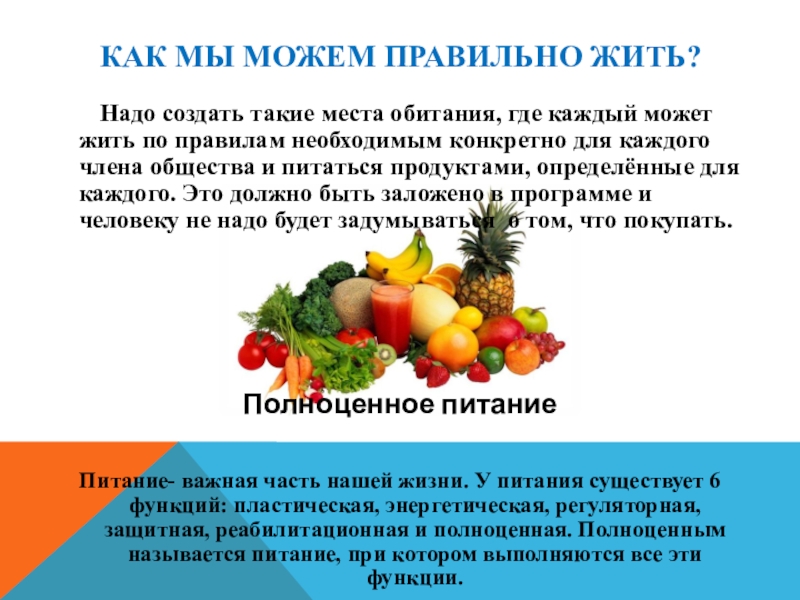 Питание- важная часть нашей жизни. У питания существует 6 функций: пластическая, энергетическая, регуляторная, защитная, реабилитационная и полноценная. Полноценным называется питание, при котором выполняются все эти функции.