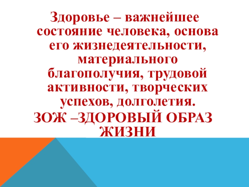 Слайд 4 Здоровье – важнейшее состояние человека, основа его жизнедеятельности, материального благополучия,