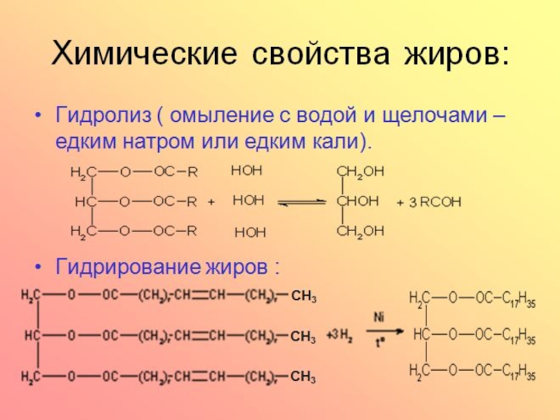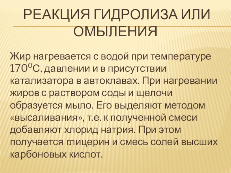 Реакция гидролиза или омыленияЖир нагревается с водой при температуре 1700С, давлении и в присутствии катализатора в