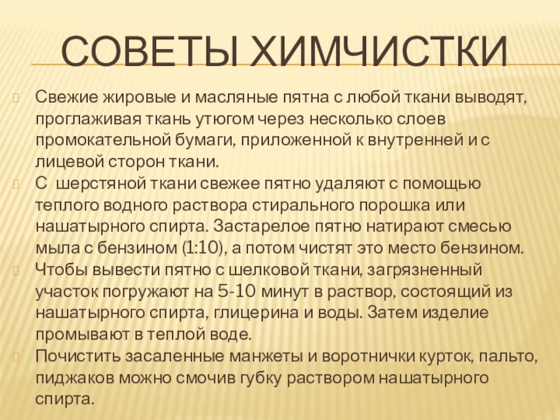 советы химчисткиСвежие жировые и масляные пятна с любой ткани выводят, проглаживая ткань утюгом через несколько слоев промокательной