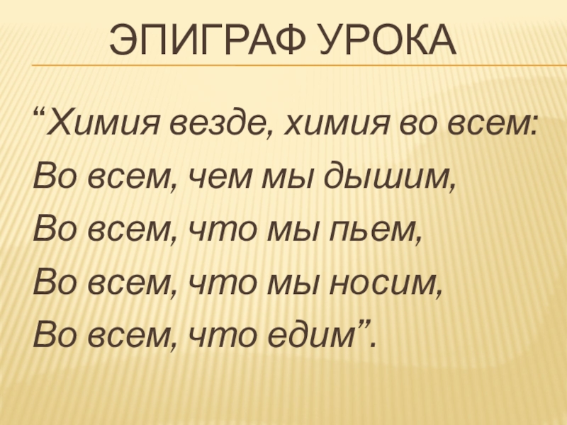 Эпиграф урока“Химия везде, химия во всем:Во всем, чем мы дышим,Во всем, что мы пьем,Во всем, что мы