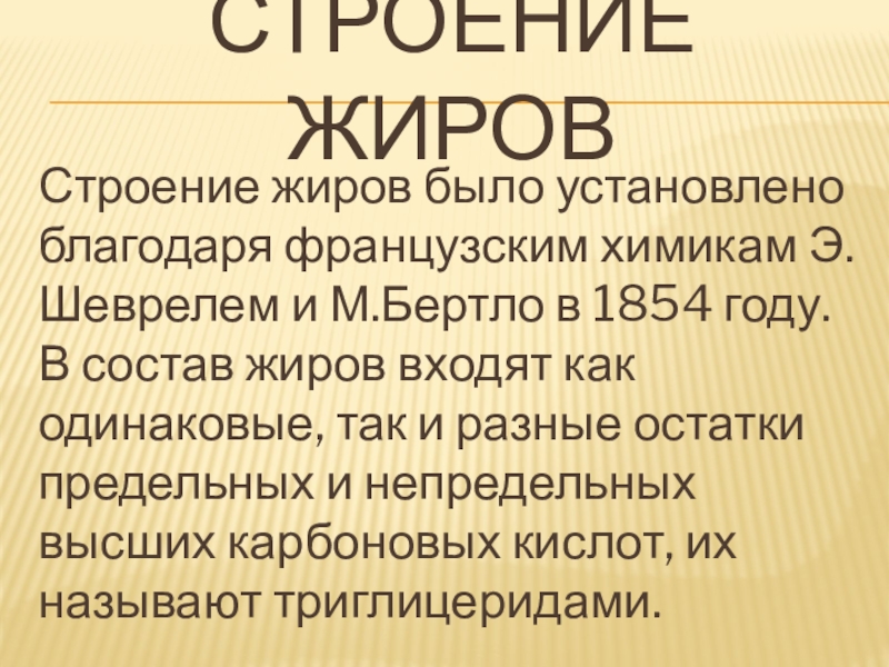 Строение жиров было установлено благодаря французским химикам Э.Шеврелем и М.Бертло