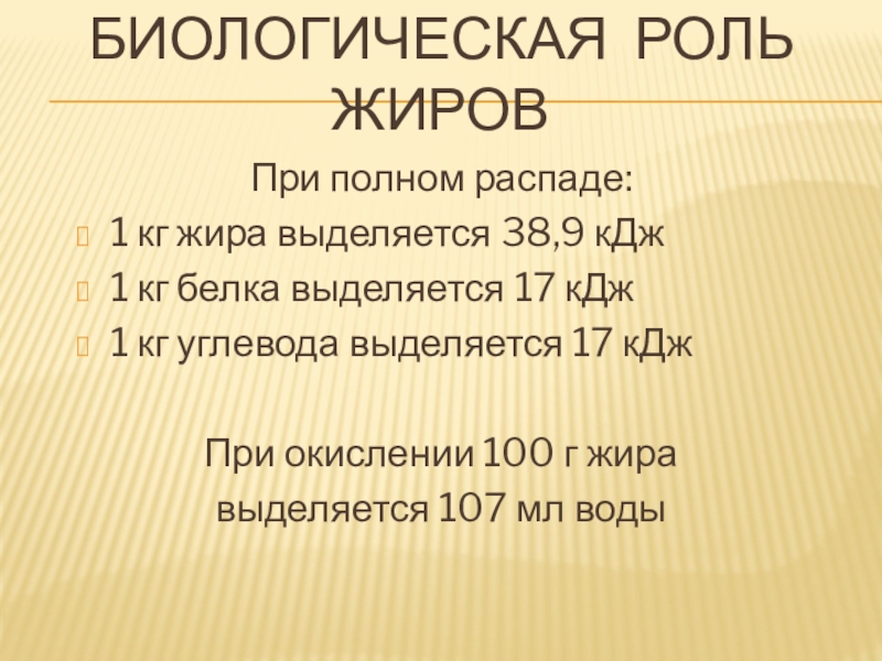 Биологическая роль жировПри полном распаде:1 кг жира выделяется 38,9 кДж1 кг белка выделяется 17 кДж1 кг углевода