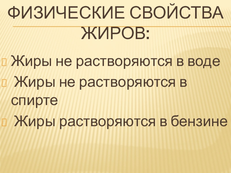 Физические свойства жиров:Жиры не растворяются в воде Жиры не растворяются в спирте Жиры растворяются в бензине