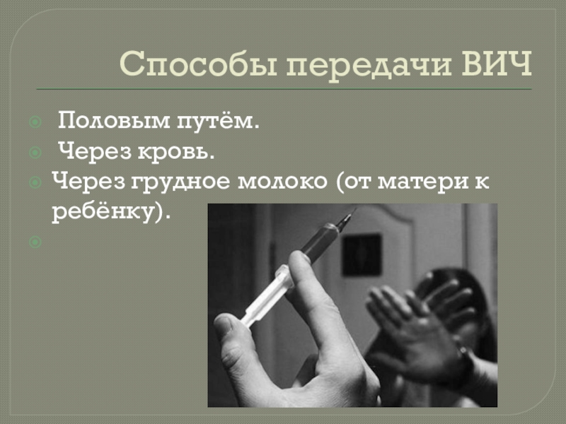 Способы передачи ВИЧ Половым путём. Через кровь.Через грудное молоко (от матери к ребёнку).