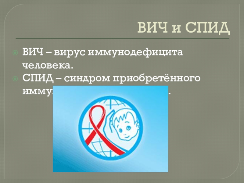 ВИЧ и СПИД ВИЧ – вирус иммунодефицита человека.СПИД – синдром приобретённого