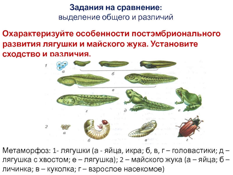 Метаморфоз: 1- лягушки (а - яйца, икра; б, в, г – головастики; д – лягушка с хвостом; е – лягушка); 2 – майского жука (а – яйца; б – личинка; в – куколка; г – взрослое насекомое)