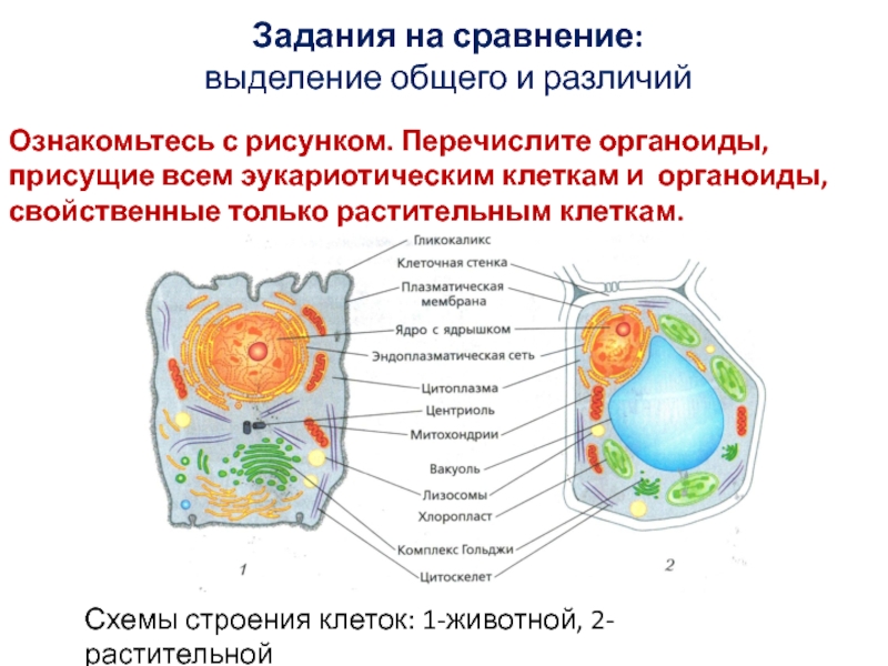 Ознакомьтесь с рисунком. Перечислите органоиды, присущие всем эукариотическим клеткам и органоиды, свойственные только растительным клеткам.