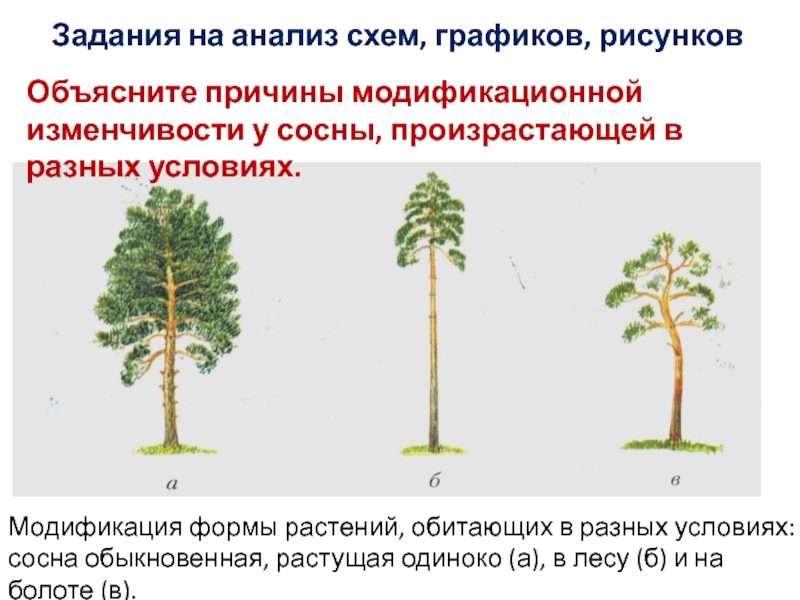 Объясните причины модификационной изменчивости у сосны, произрастающей в разных условиях.