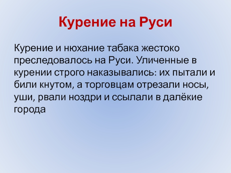 Курение на РусиКурение и нюхание табака жестоко преследовалось на Руси. Уличенные в курении строго наказывались: их пытали