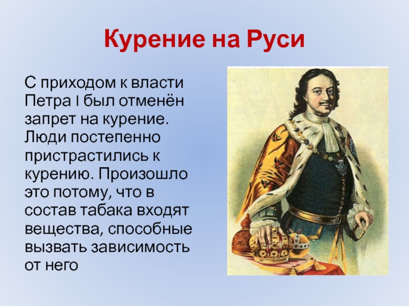 Курение на РусиС приходом к власти Петра I был отменён запрет на курение. Люди постепенно пристрастились к