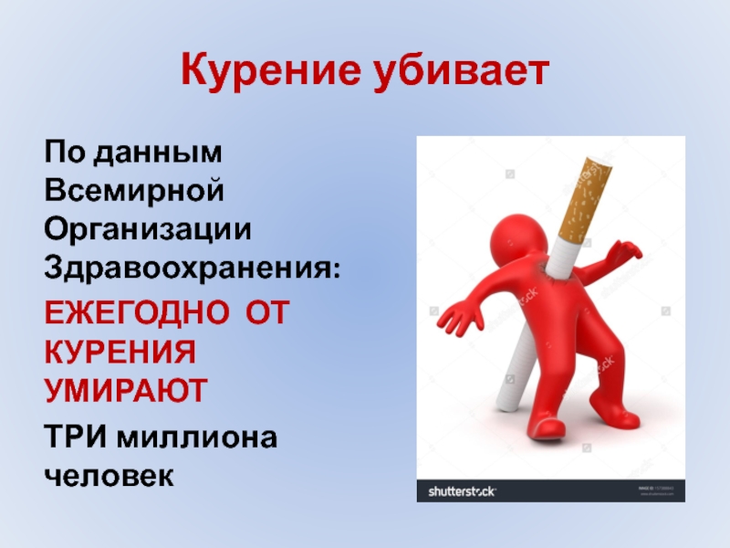 Курение убиваетПо данным Всемирной Организации Здравоохранения:ЕЖЕГОДНО ОТ КУРЕНИЯ УМИРАЮТТРИ миллиона    человек