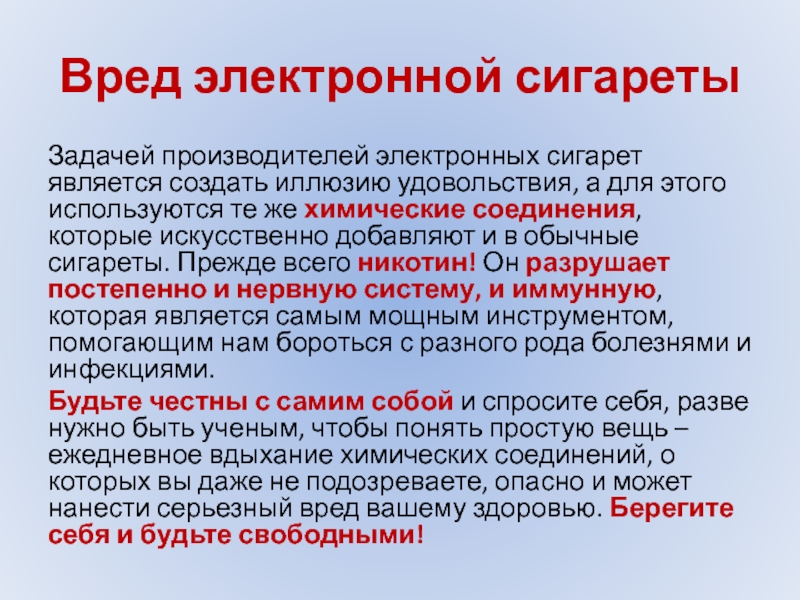 Вред электронной сигаретыЗадачей производителей электронных сигарет является создать иллюзию удовольствия, а для этого используются те же химические