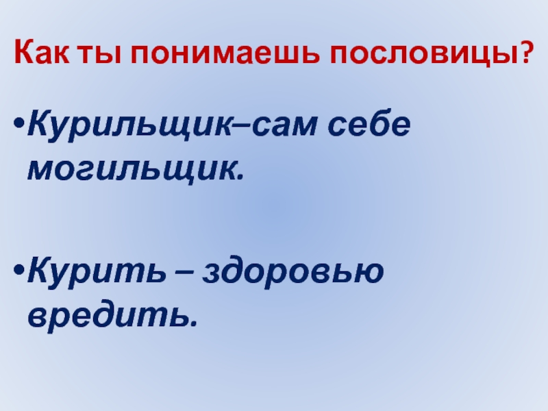 Как ты понимаешь пословицы?Курильщик–сам себе могильщик. Курить – здоровью вредить.