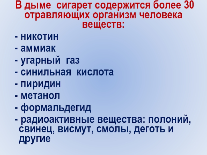В дыме сигарет содержится более 30 отравляющих организм человека веществ: - никотин - аммиак - угарный