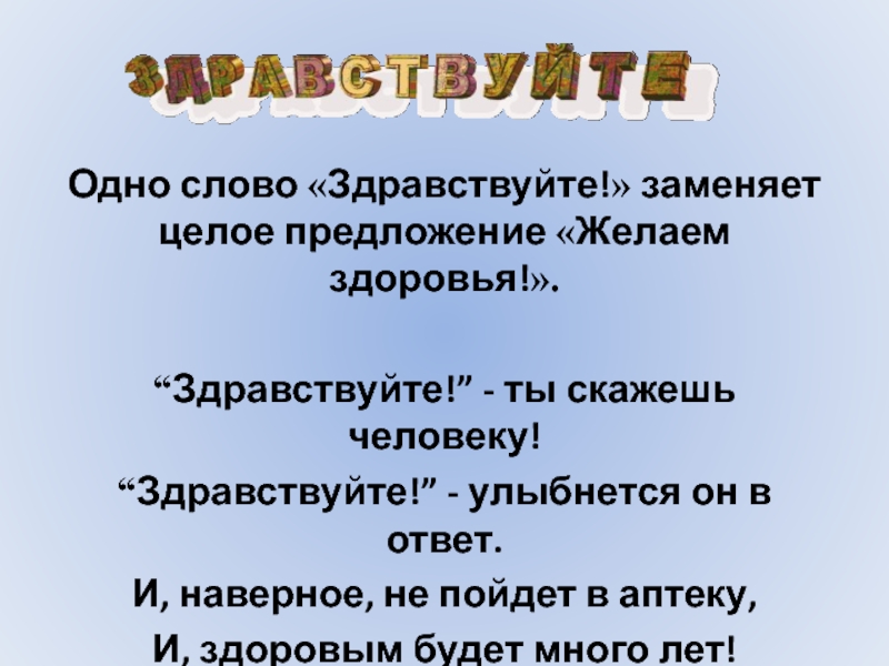 Одно слово «Здравствуйте!» заменяет целое предложение «Желаем здоровья!».“Здравствуйте!” - ты скажешь человеку! “Здравствуйте!” - улыбнется он в