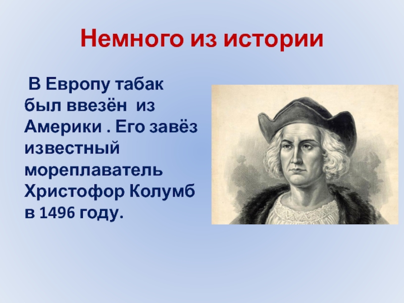Немного из истории В Европу табак был ввезён из Америки . Его завёз известный мореплаватель Христофор Колумб