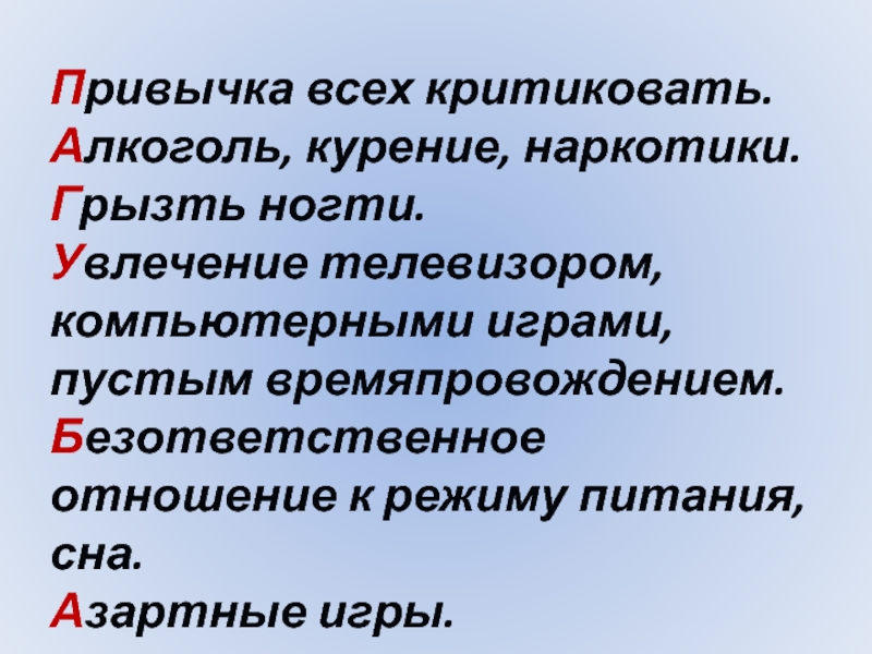Привычка всех критиковать.Алкоголь, курение, наркотики. Грызть ногти.Увлечение телевизором, компьютерными играми, пустым времяпровождением.Безответственное отношение к режиму питания, сна.