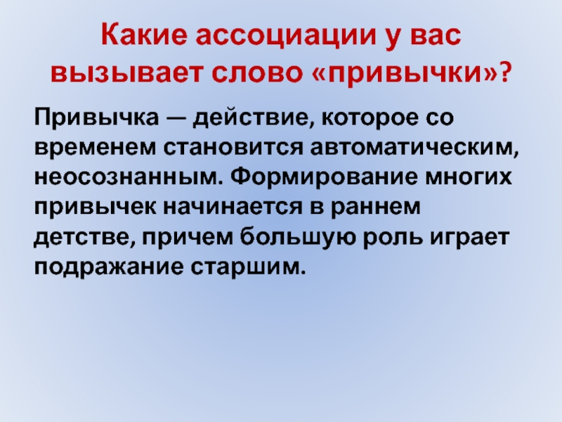Какие ассоциации у вас вызывает слово «привычки»?Привычка — действие, которое со временем становится автоматическим, неосознанным. Формирование многих