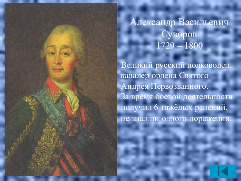 Великий русский полководец, кавалер ордена Святого Андрея Первозванного. За время боевой деятельности получил 6 тяжёлых ранений, не знал ни одного поражения.