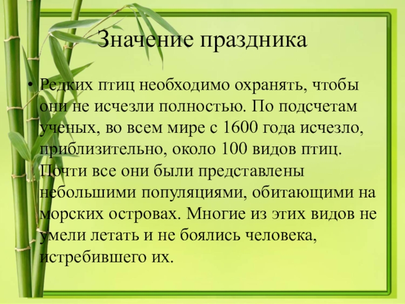 Значение праздникаРедких птиц необходимо охранять, чтобы они не исчезли полностью. По подсчетам ученых, во всем мире с