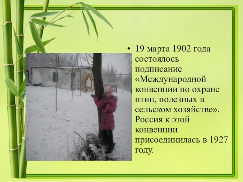 19 марта 1902 года состоялось подписание «Международной конвенции по охране птиц, полезных в сельском хозяйстве». Россия к этой конвенции присоединилась в 1927 году.