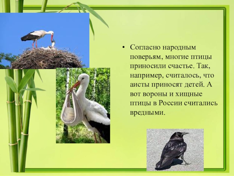 Согласно народным поверьям, многие птицы приносили счастье. Так, например, считалось, что аисты приносят детей. А вот вороны