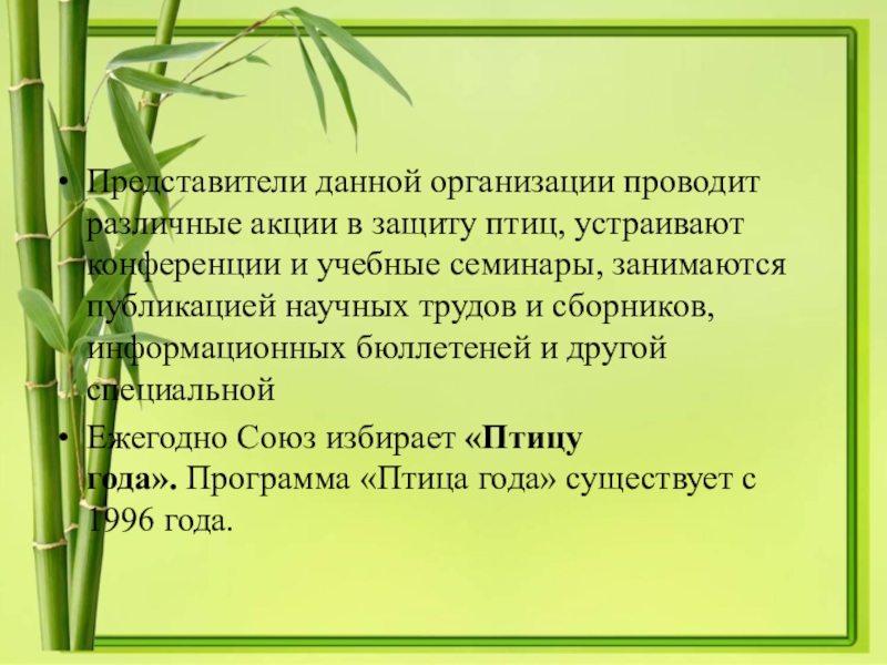 Представители данной организации проводит различные акции в защиту птиц, устраивают конференции