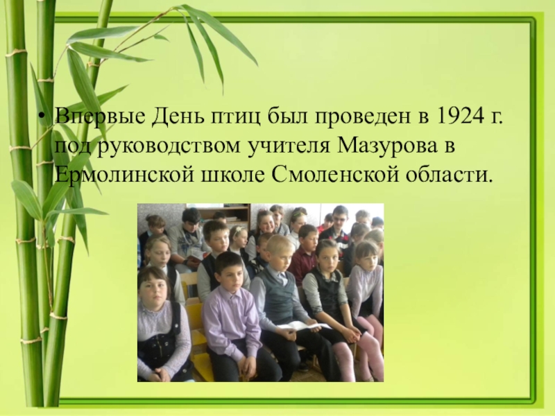 Впервые День птиц был проведен в 1924 г. под руководством учителя Мазурова в Ермолинской школе Смоленской области.