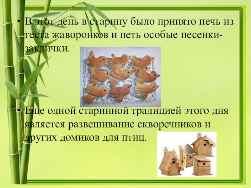 Еще одной старинной традицией этого дня является развешивание скворечников и других домиков для птиц.