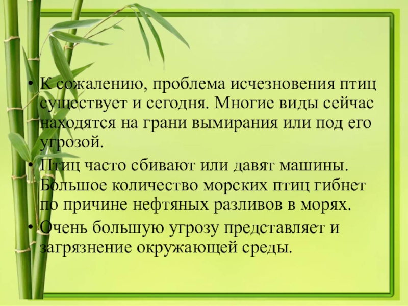 К сожалению, проблема исчезновения птиц существует и сегодня. Многие виды сейчас