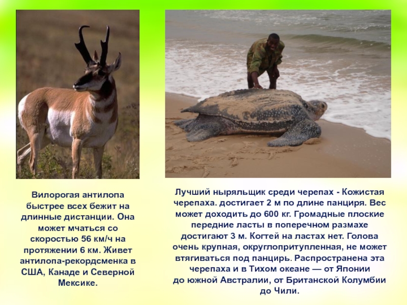 Лучший ныряльщик среди черепах - Кожистая черепаха. достигает 2 м по длине панциря. Вес может доходить до 600 кг. Громадные плоские передние ласты в поперечном размахе достигают 3 м. Когтей на ластах нет. Голова очень крупная, округлопритупленная, не может втягиваться под панцирь. Распространена эта черепаха и в Тихом океане — от Японии