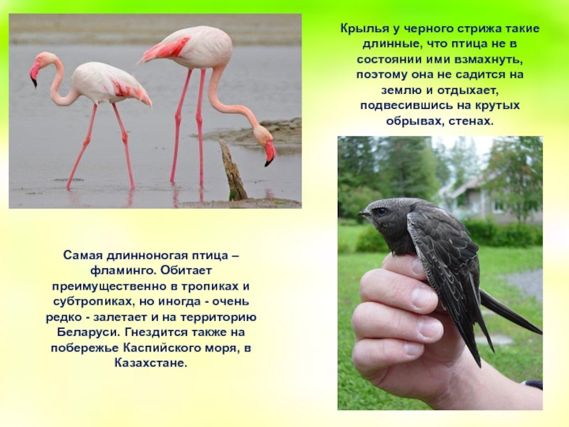 Крылья у черного стрижа такие длинные, что птица не в состоянии ими взмахнуть, поэтому она не садится на землю и отдыхает, подвесившись на крутых обрывах, стенах.