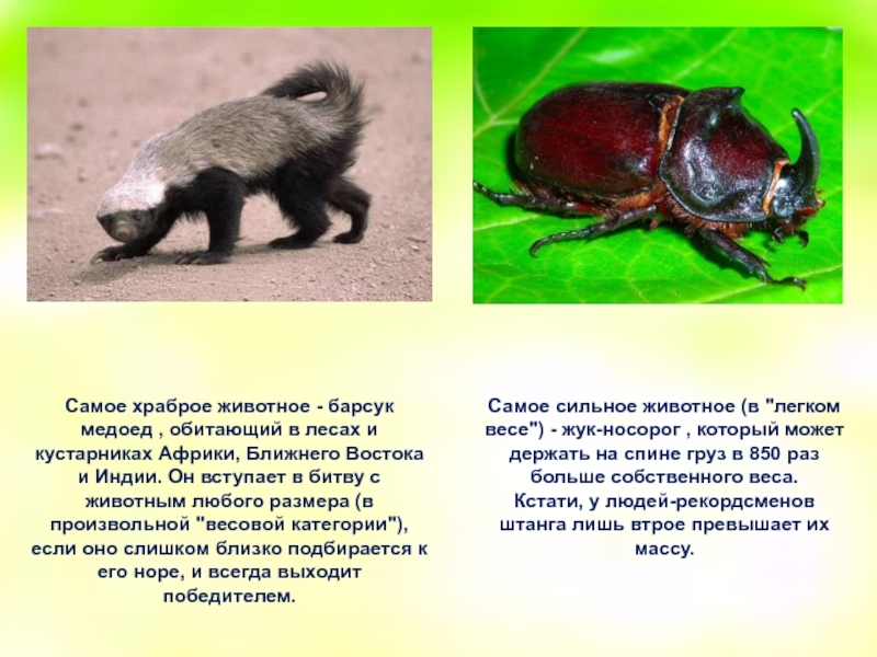 Самое сильное животное (в "легком весе") - жук-носорог , который может держать на спине груз в 850 раз больше собственного веса.