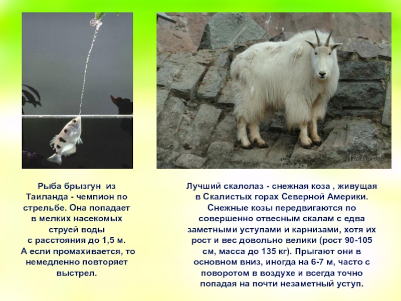 Лучший скалолаз - снежная коза , живущая в Скалистых горах Северной Америки. Снежные козы передвигаются по совершенно отвесным скалам с едва заметными уступами и карнизами, хотя их рост и вес довольно велики (рост 90-105 см, масса до 135 кг). Прыгают они в основном вниз, иногда на 6-7 м, часто с поворотом в воздухе и всегда точно попадая на почти незаметный уступ.