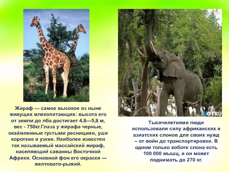 Жираф — самое высокое из ныне живущих млекопитающих: высота его от земли до лба достигает 4,8—5,8 м, вес - 750кг.Глаза у жирафа черные, окаймленные густыми ресницами, уши короткие и узкие. Наиболее известен так называемый массайский жираф, населяющий саванны Восточной Африки. Основной фон его окраски — желтовато-рыжий.
